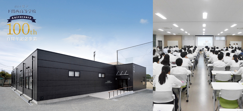 下関西高校百周年記念事業の一環として旭陵館が完成しました。同窓会による建築ののち県へ寄贈され、現在は学校の施設として授業や行事、放課後の自習教室として大いに活用されています。本事業へ多くの皆様から募金の御協力を頂き、誠にありがとうございました。